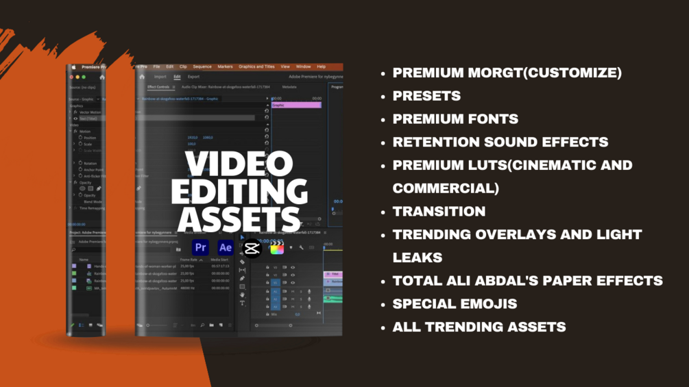 In this product we included Premium MORGT(customize), Presets, Premium fonts, Retention sound effects, Premium LUTS, Transition, Trending overlays and light leaks, Ali abdal's paper effects, special emoji's and much more